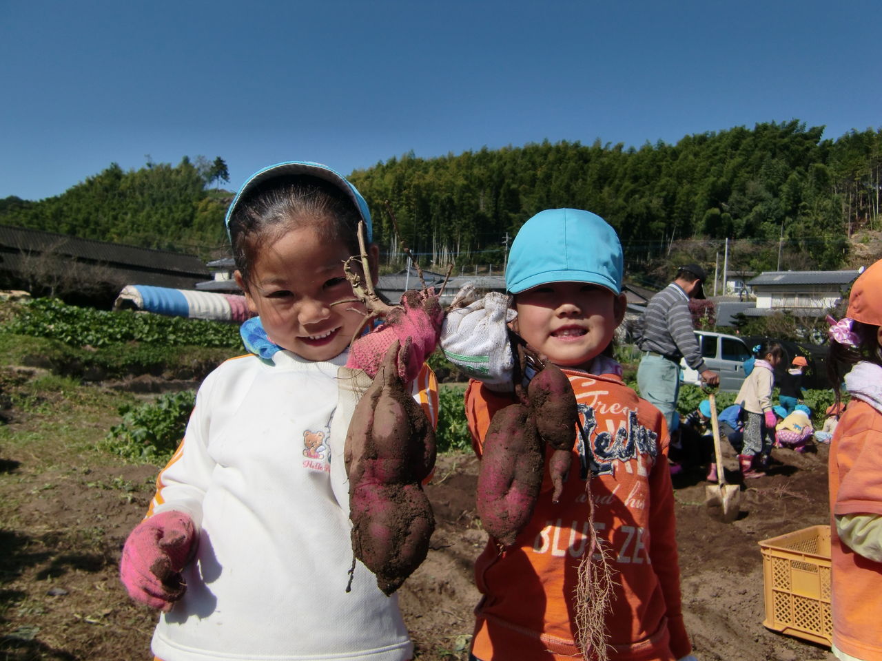 もも組・うめ組さんが収穫してきたお芋・大根を在園児みんなで
