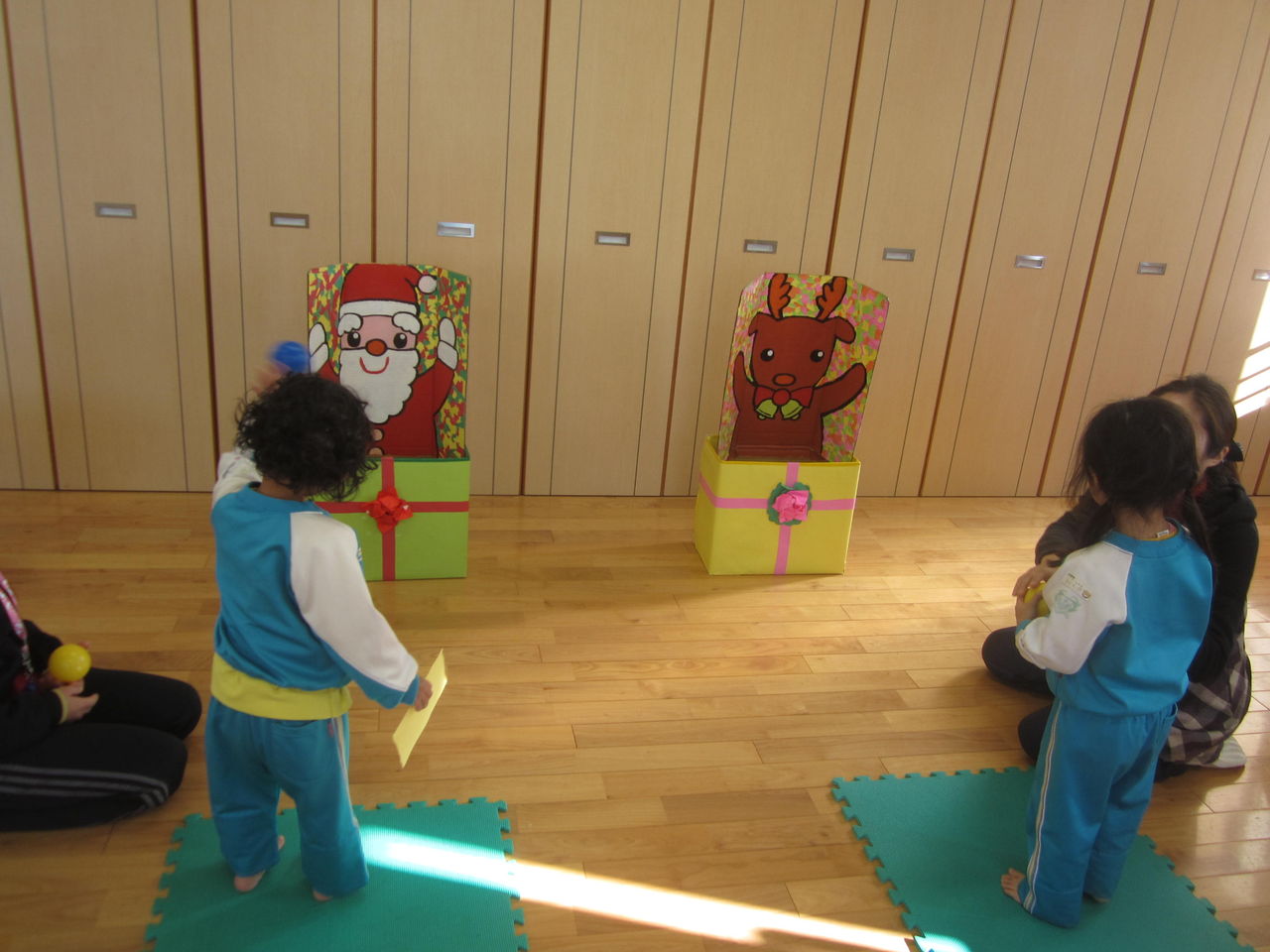 クリスマスツリーの的をめがけて「えいっ」